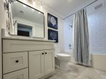 The guest bathroom has a shower/tub combo.